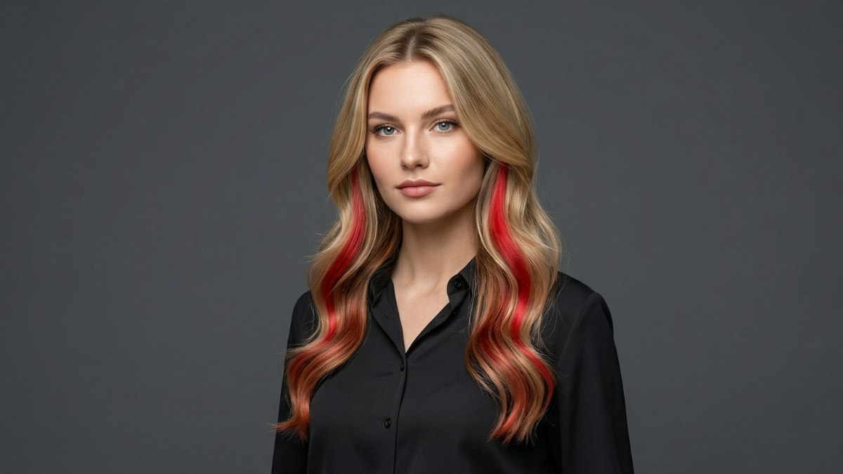 Ces accents de couleur ne passent pas inaperçus. Lorsque les cheveux bougent, les rouges et les oranges scintillent et s'enflamment, créant un effet dynamique sur le fond blond plus doux. C'est une combinaison à la fois chaleureuse et puissante, féminine et ardente.