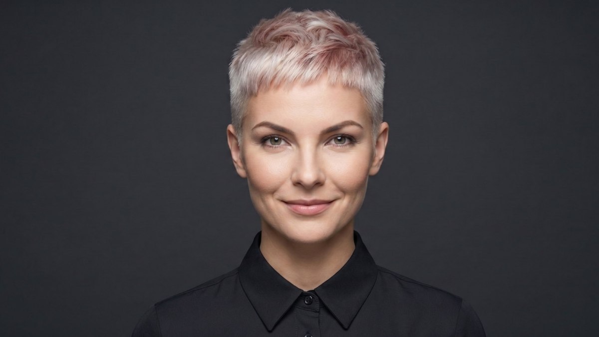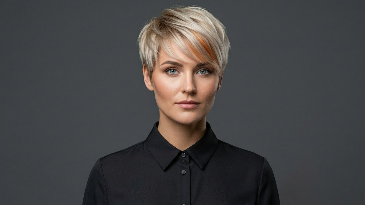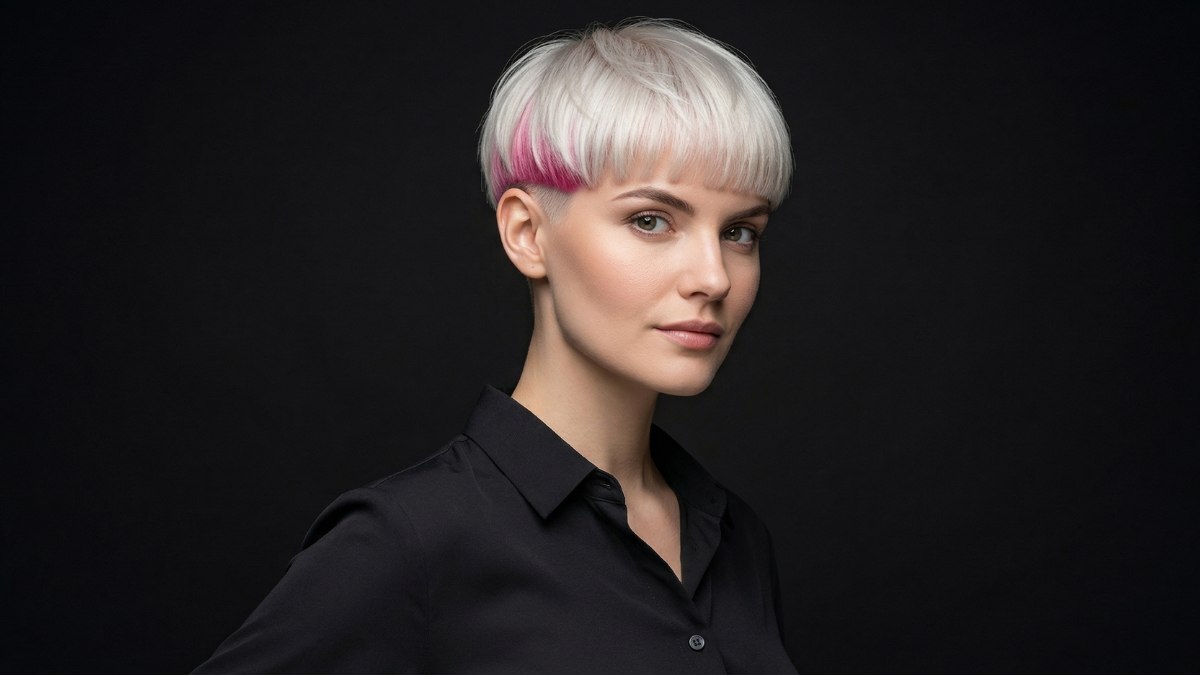 Les cheveux courts prennent une toute nouvelle dimension dans ce look audacieux, taillé pour les adeptes des tendances. La base est un blond froid, presque blanc ; une couleur qui exige à la fois engagement et assurance, car elle ne s'obtient pas du jour au lendemain et réclame un entretien rigoureux. Mais le résultat est saisissant.
