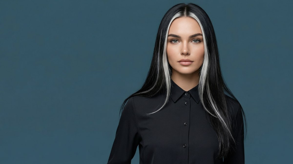 Voici une coiffure pour les femmes qui aiment un look dramatique mais portable, entièrement fondé sur la puissance du contraste : une base de cheveux noirs brillants avec des mèches blanches éclatantes qui descendent de la racine jusqu'aux pointes de chaque côté du visage. Le résultat est frappant, sans jamais être excessif.
