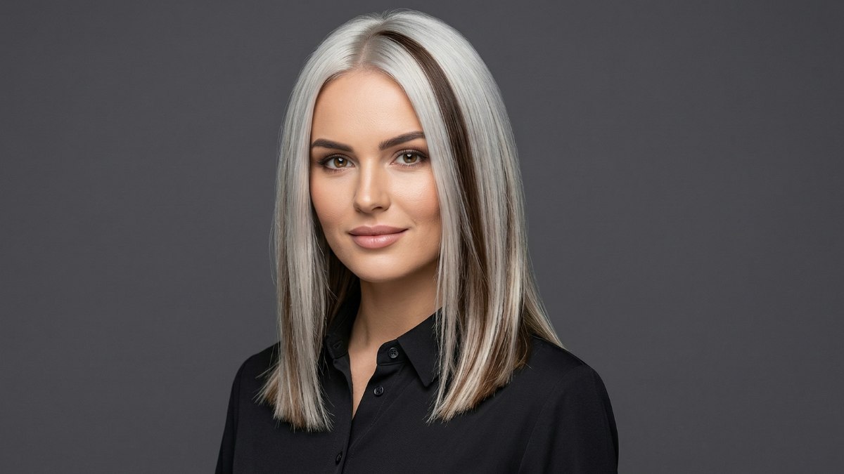 Ce look, destiné aux femmes audacieuses, métamorphose un carré classique et lisse en quelque chose d'exceptionnel en jouant avec le contraste le plus saisissant qui soit : un brun profond, presque noir, face à un blanc argenté éclatant.