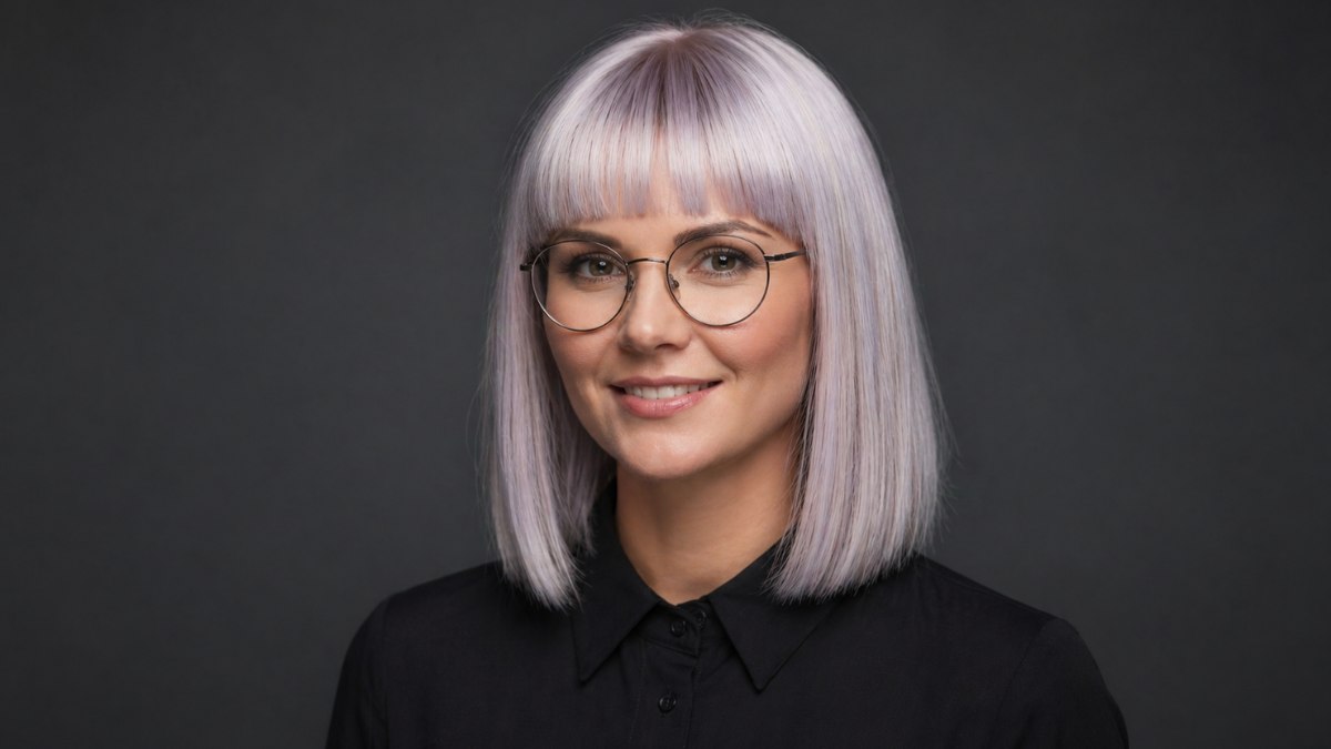La coupe est un carré classique effleurant les épaules, avec une frange droite tombant juste au-dessus des sourcils. Tout est lisse, droit et brillant. La simplicité de la coupe laisse la couleur s'imposer seule, sans la concurrence de dégradés, d'ondulations ou de coiffages élaborés.