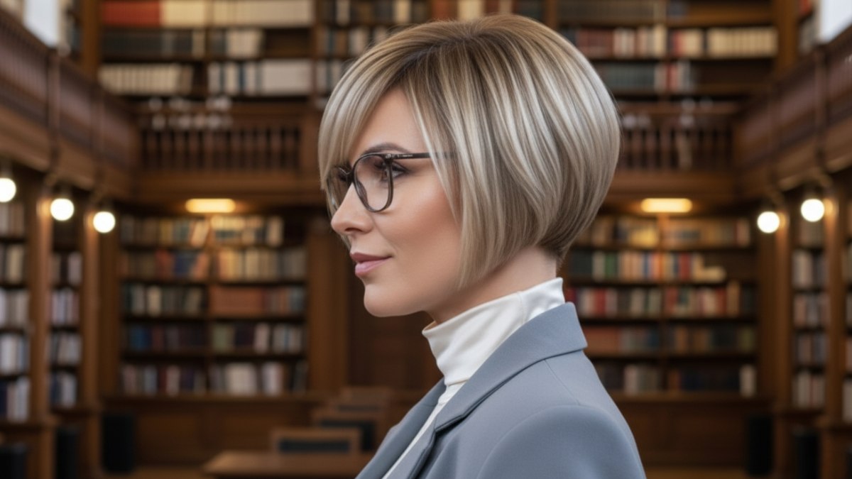 Le choix d’un col roulé blanc soyeux et d’un blazer complète idéalement la coiffure. Le col montant offre un fond net qui met les cheveux en valeur, tandis que la structure du blazer reflète la précision de la coupe. La teinte froide du blazer s’accorde harmonieusement au blond cendré, créant un ensemble monochrome très cohérent. Cette association montre que le carré anguleux fonctionne en toutes circonstances, avec une simplicité raffinée et un goût impeccable.