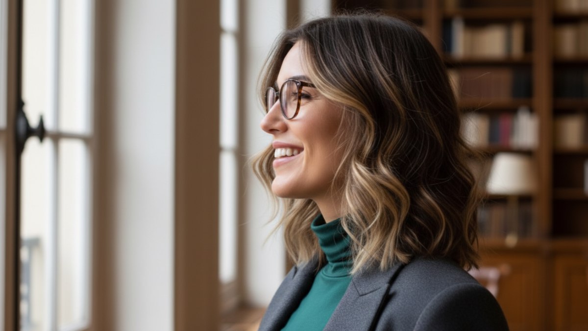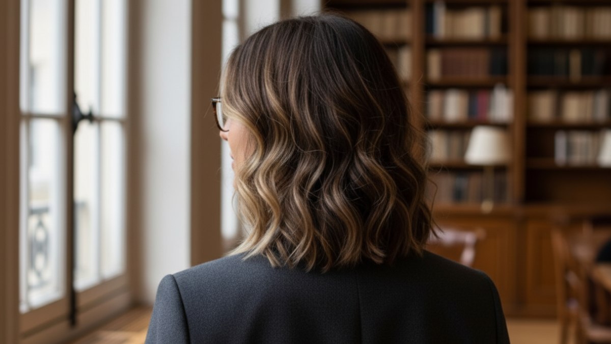 Associé à un col roulé soyeux bleu canard et un blazer anthracite, l’ensemble est d’une élégance remarquable. Le bleu canard contraste magnifiquement avec les tons caramel des cheveux, faisant ressortir chaque détail. Le col montant crée une toile de fond nette, tandis que le blazer apporte de la structure. Cette combinaison de cheveux ondulés et de vêtements ajustés est moderne, sophistiquée et idéale pour une vie aux multiples facettes.