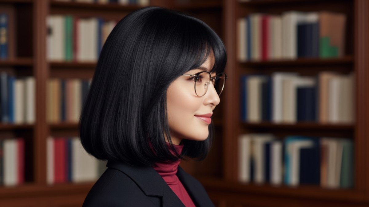 L’association avec le col roulé soyeux couleur bordeaux et le blazer noir est un choix remarquable. La teinte vin profonde apporte une chaleur subtile qui complète le noir froid des cheveux, tandis que la veste structurée fait écho à la précision géométrique de la coupe. Portée avec des lunettes, l’ensemble transmet sophistication, compétence et goût raffiné. Parfait pour faire forte impression !