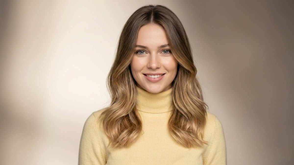 La couleur est l'élément qui rend ce look véritablement irrésistible. Elle repose sur une base brun chaud, rehaussée de mèches caramel plus claires qui se fondent subtilement dans la masse. Le résultat est si naturel que l’on pourrait croire qu’il s’agit de votre couleur d’origine. Portée avec un col roulé lilas, la chaleur de la chevelure ressort avec encore plus d'éclat.