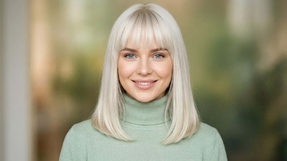 Ce style agit comme une véritable bouffée d’air frais. Les cheveux arborent une nuance de blond spectaculaire, si claire qu’elle semble presque irradier. Située entre le platine et la nacre, cette teinte se marie magnifiquement avec le contraste d'un col roulé vert. C’est un choix audacieux, qui demeure pourtant d'une élégance absolue.