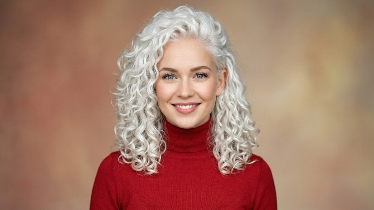 Le volume est la véritable star de cette coiffure spectaculaire. Ces boucles d’un blanc éclatant sont pleines d’énergie et s’accordent à merveille avec le rouge profond d’un col roulé. Le contraste saisissant entre la pureté de la chevelure et l'intensité du tissu suffit à captiver tous les regards.