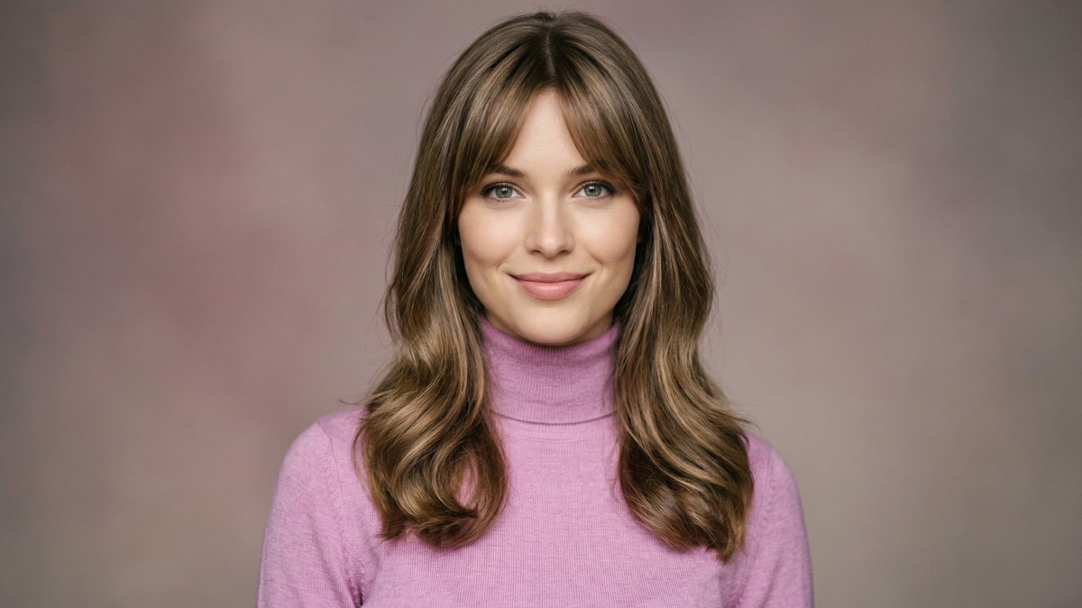 Une frange rideau vient parfaire l'ensemble en se fondant harmonieusement dans le mouvement des ondulations. Le col roulé rose poudré apporte la touche finale idéale : sa couleur délicate souligne les reflets chauds sans jamais les éclipser. Au final, cette coiffure évoque le romantisme, la décontraction et une modernité pleine de douceur.