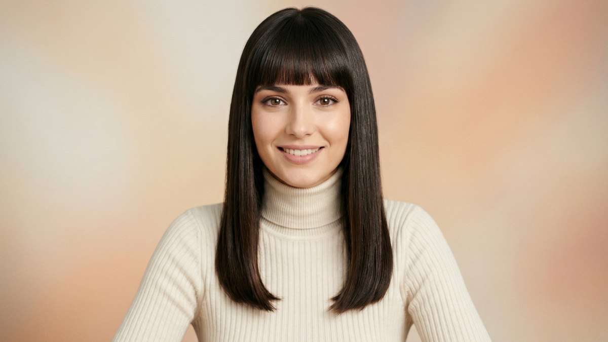 La frange est ici l’élément clé de la structure. Alors que les autres styles de cette sélection privilégient la douceur et les courbes, celui-ci mise entièrement sur la précision. La coupe droite encadre le visage, tandis que la couleur foncée, presque ébène, apporte une intensité dramatique. Associée à un col roulé ivoire, le contraste est tout simplement impeccable.