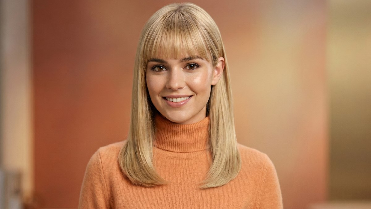 La coupe, tombant légèrement au-delà de la clavicule, est agrémentée d’une frange effilée. Les mèches de la frange restent fines et vaporeuses, apportant une touche de délicatesse à l’ensemble du visage. Le reste de la chevelure est lissé afin de mettre pleinement en valeur la richesse de cette nuance dorée.