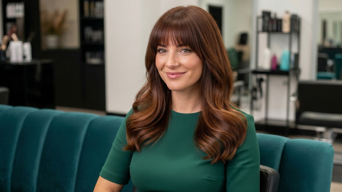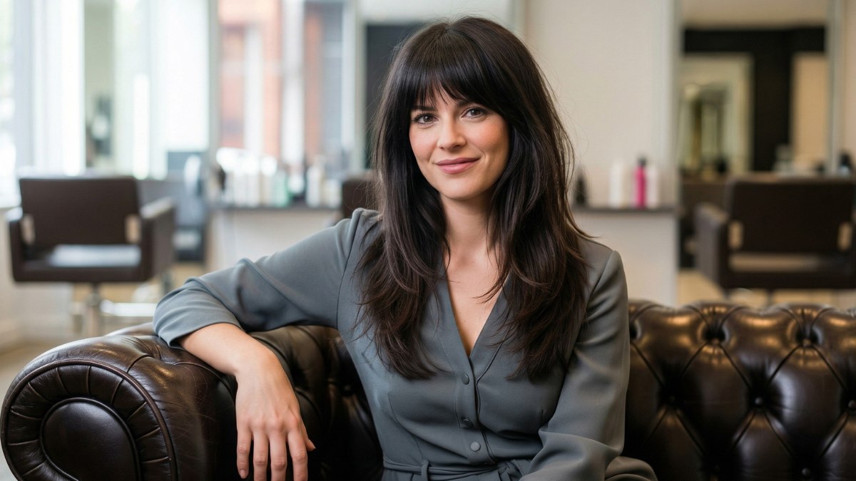 La coupe se distingue par une frange pleine et droite, s'arrêtant juste sous la ligne des sourcils pour offrir un cadre doux et subtilement rétro au regard. Sous cette structure, les cheveux se déploient en longues ondulations avec un effet ombré délicat qui s’illumine vers les pointes. Le contraste est fascinant : la rigueur de la frange répond à la fluidité romantique des longueurs.