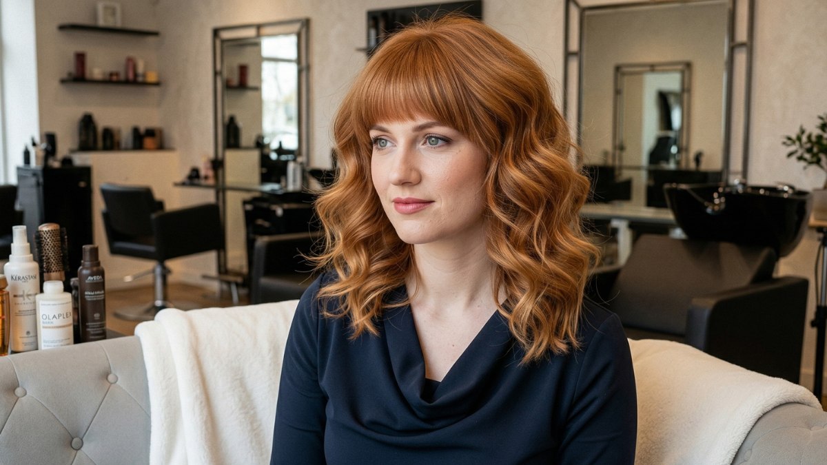 La frange, légère et subtilement effilée, se pose juste au-dessus des sourcils sans jamais paraître massive. Elle insuffle une touche ludique et délicatement rétro qui s’harmonise à la perfection avec la chaleur incandescente du cuivre.