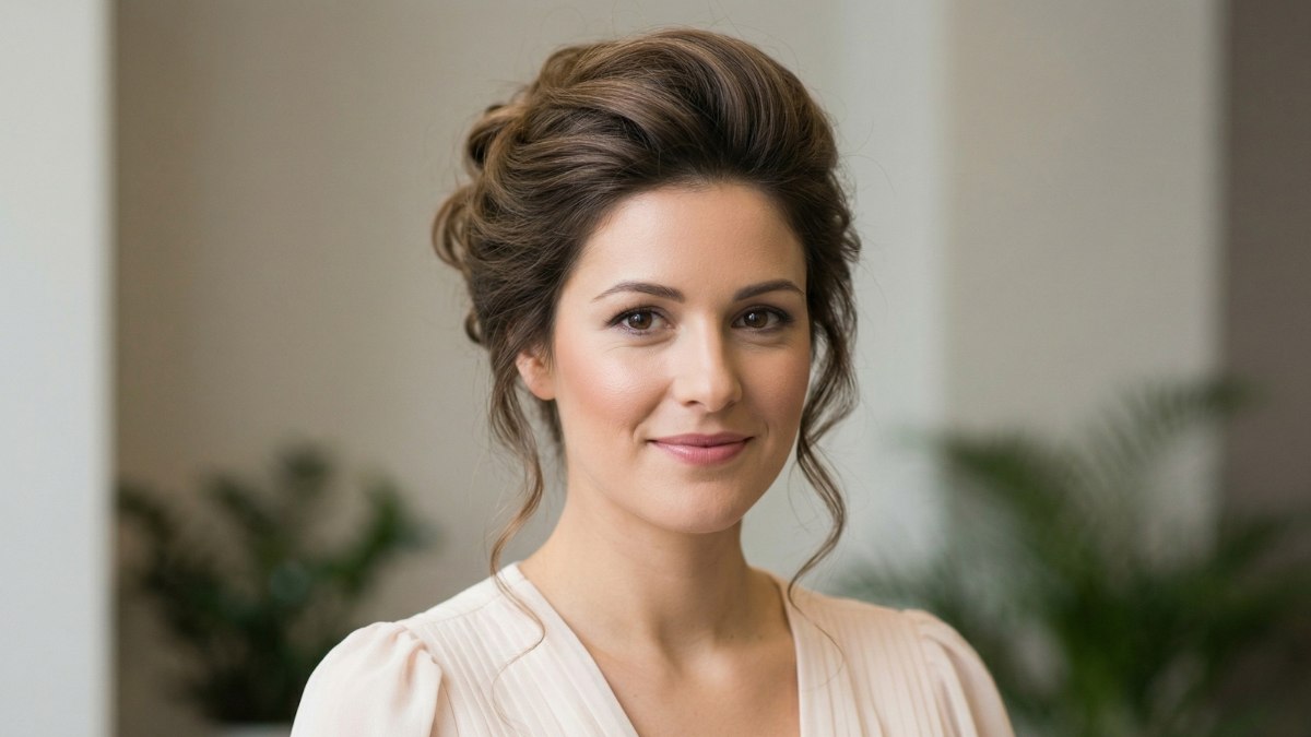 Ce look mise avant tout sur le volume, la texture et une bonne dose de glamour. Ici, les cheveux châtains sont relevés en un chignon haut qui réussit le pari d'être à la fois très soigné et plein de liberté. Des mèches ondulées et souples viennent encadrer le visage, tandis que l’arrière est travaillé pour créer un chignon texturé qui donne beaucoup de vie et de relief à l'ensemble.