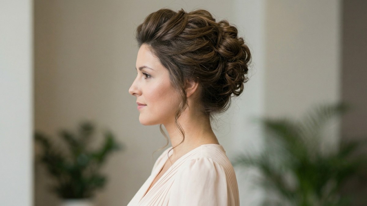 Le volume placé en hauteur attire le regard vers le haut, ce qui aide à élancer la silhouette et à allonger le cou. Quelques boucles plus douces s'échappent autour du visage pour conserver une touche de délicatesse. Le résultat est joyeux, dynamique et parfait pour une grande fête.