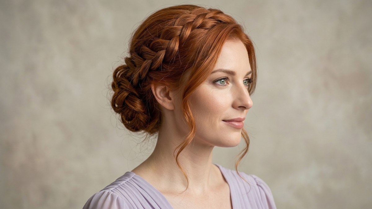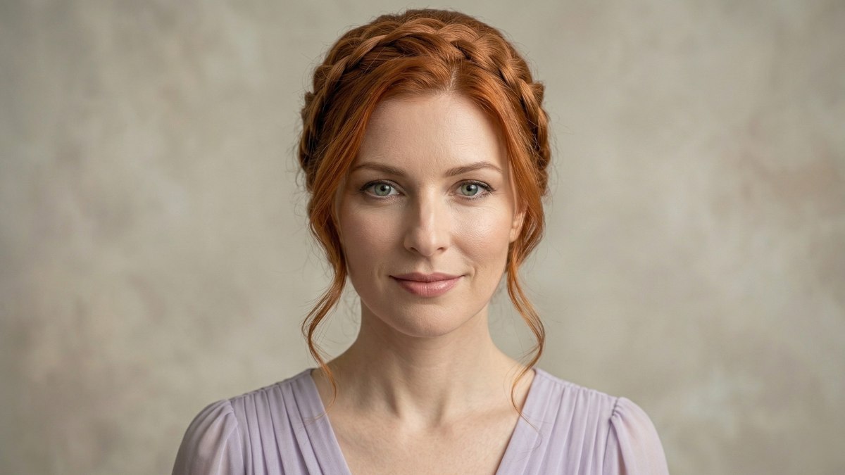 Si la couronne tressée reste un grand classique indémodable, c'est parce qu'elle est incroyablement romantique et donne l’impression de porter une véritable œuvre d’art. Pour ce look, de superbes cheveux auburn sont tressés pour former une couronne qui entoure la tête comme un halo de lumière. Quelques mèches vaporeuses retombent avec légèreté le long du cou et du visage.