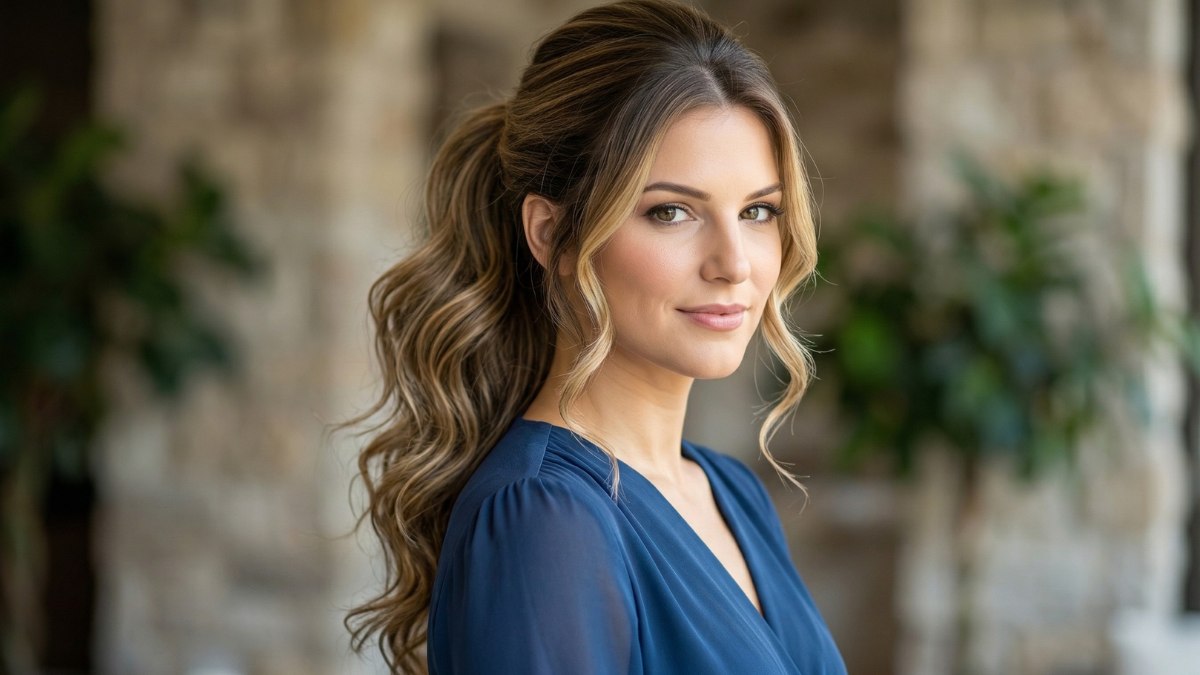 Ce look est la preuve qu’une queue de cheval bien exécutée peut être tout aussi distinguée qu’un chignon élaboré. Les cheveux longs, mis en valeur par des mèches plus claires, sont rassemblés en une queue de cheval haute qui retombe en de larges ondulations pleines de ressort. Le sommet de la tête est lissé avec soin pour un rendu net et impeccable, alors que les vagues souples à l’arrière apportent un mouvement irrésistible.