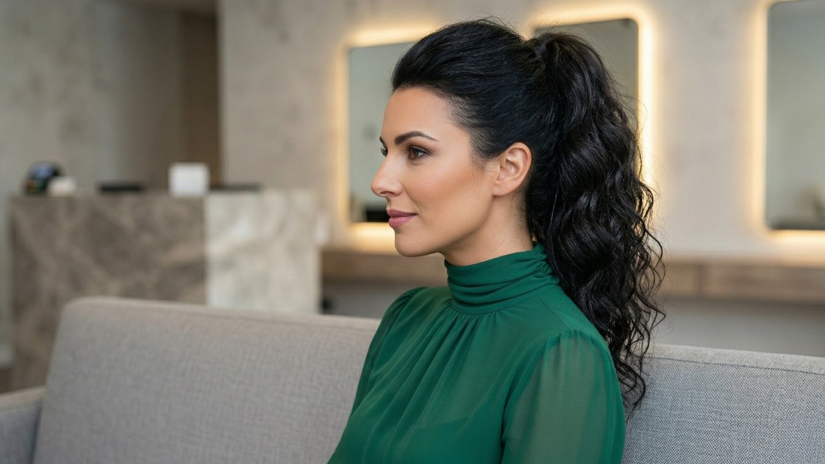 Le style met en valeur les traits du visage en ouvrant le regard et en soulignant les pommettes. Les lignes nettes sur les côtés assurent un fini professionnel et soigné. La hauteur de la queue de cheval dessine une silhouette élancée, tandis que les boucles en cascade apportent une belle énergie à votre démarche.