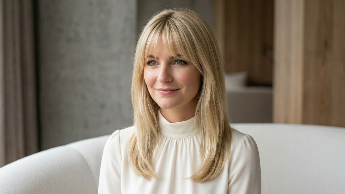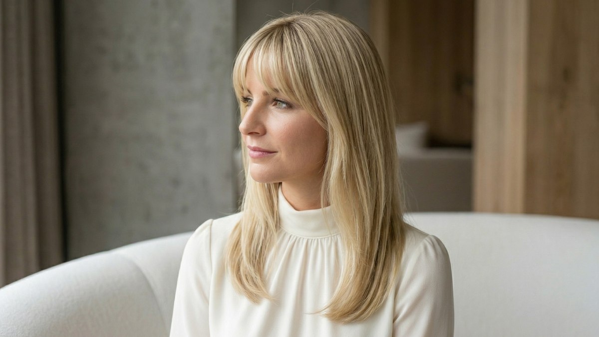 Cette coiffure dégage une aura de douceur et de bienveillance. Les nuances de blond captent chaque rayon de lumière, offrant aux cheveux un éclat sain et brillant. Comme la chevelure conserve son mouvement naturel, avec de légères ondulations sur les pointes, le résultat n'est jamais lourd ni figé.