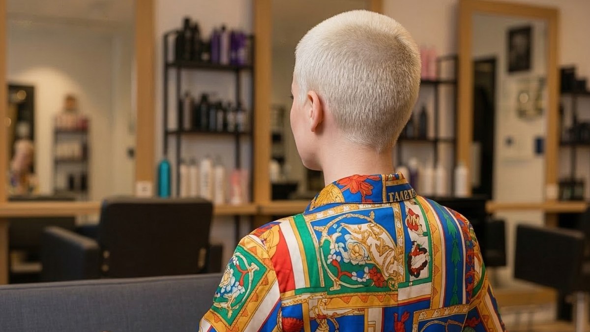 Cette coupe ultra-courte blond platine est l’ultime affirmation d’une féminité audacieuse. C’est le type de coupe porté par des femmes qui refusent de laisser leurs cheveux les définir… et qui pourtant, d’une certaine manière, finissent par être entièrement définies par elle.