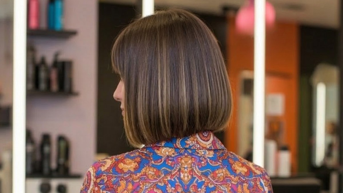 Mais ce qui le rend vraiment exceptionnel, c’est la couleur : des mèches caramel et miel travaillées dans la base brune naturelle apportent douceur et mouvement que la géométrie de la coupe seule ne pourrait jamais offrir. L’effet est lumineux, comme si les cheveux avaient été doucement éclaircis par des mois de soleil.