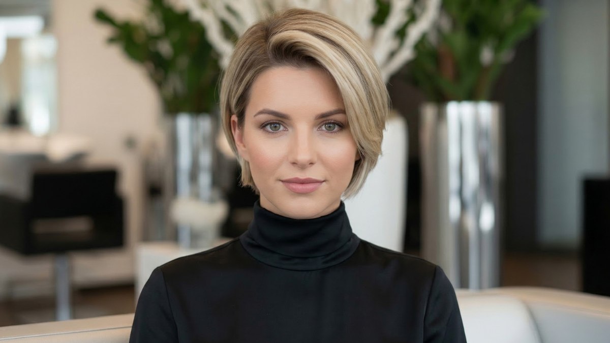 Cette coupe courte blonde incarne la sophistication moderne. Les mèches dégradées à la nuque apportent volume et texture, tandis qu’une raie marquée sur le côté et une mèche glissée derrière l’oreille structurent la coiffure tout en douceur. Le blond aux reflets froids, accentué par des racines plus foncées, donne de la profondeur à l’ensemble.