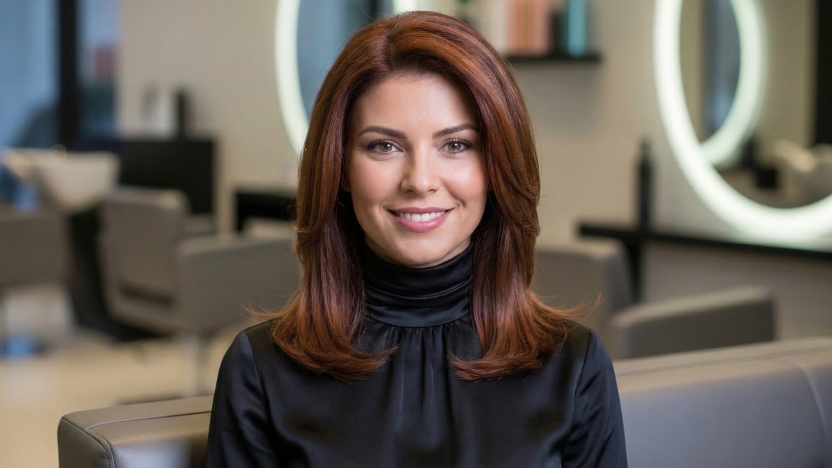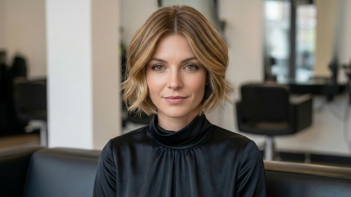 Portée de manière décontractée, avec une mèche glissée derrière l’oreille, cette coiffure dégage une fraîcheur spontanée. Les nuances chaleureuses flattent toutes les carnations et s’harmonisent parfaitement avec une blouse noire brillante pour un contraste raffiné.