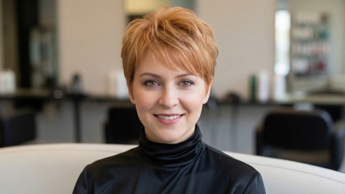 Audacieuse et pétillante, cette coupe pixie blond fraise marie des reflets dorés intenses à une touche de roux, pour une couleur chaleureuse et multidimensionnelle. Les longueurs sur le dessus apportent volume naturel et texture, tandis que les côtés plus courts confèrent une allure nette et moderne.
