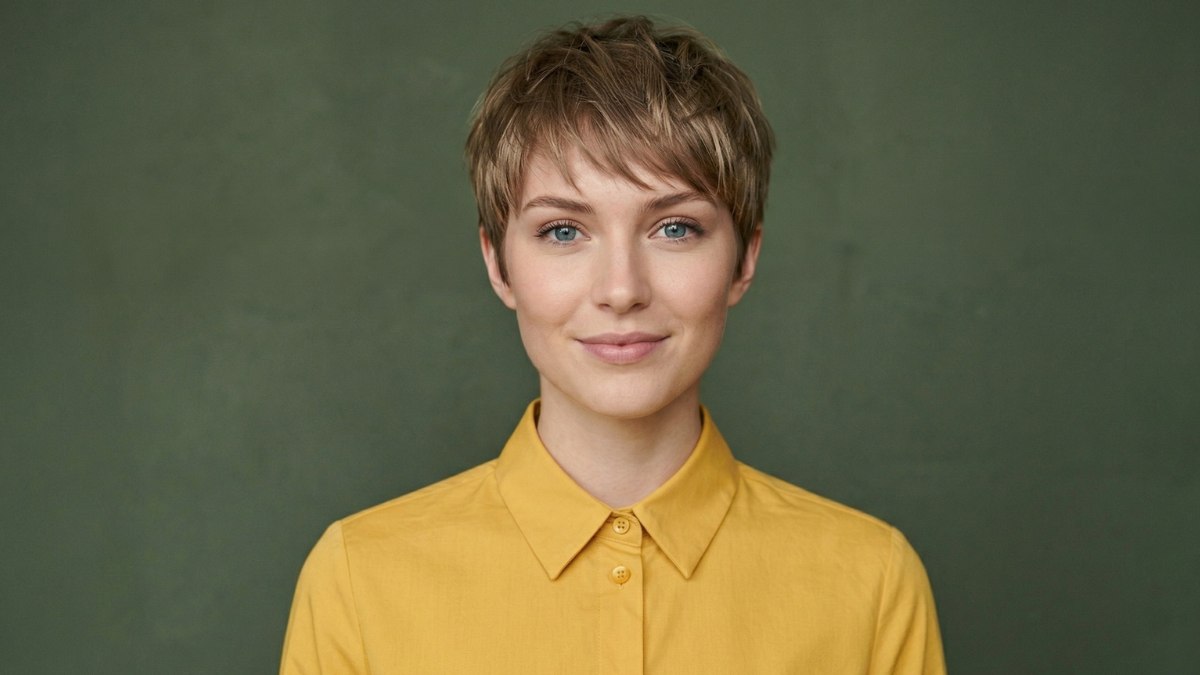 C’est l’un des changements capillaires les plus frappants de cette série. Il s’agit d’une coupe à la garçonne courte et effilée, avec des reflets blond doré sur l’ensemble de la chevelure. Elle porte une frange vaporeuse qui balaie le front et offre une allure légère. La coupe est très courte sur les côtés et à l’arrière, mais garde juste assez de longueur sur le dessus pour créer du mouvement.