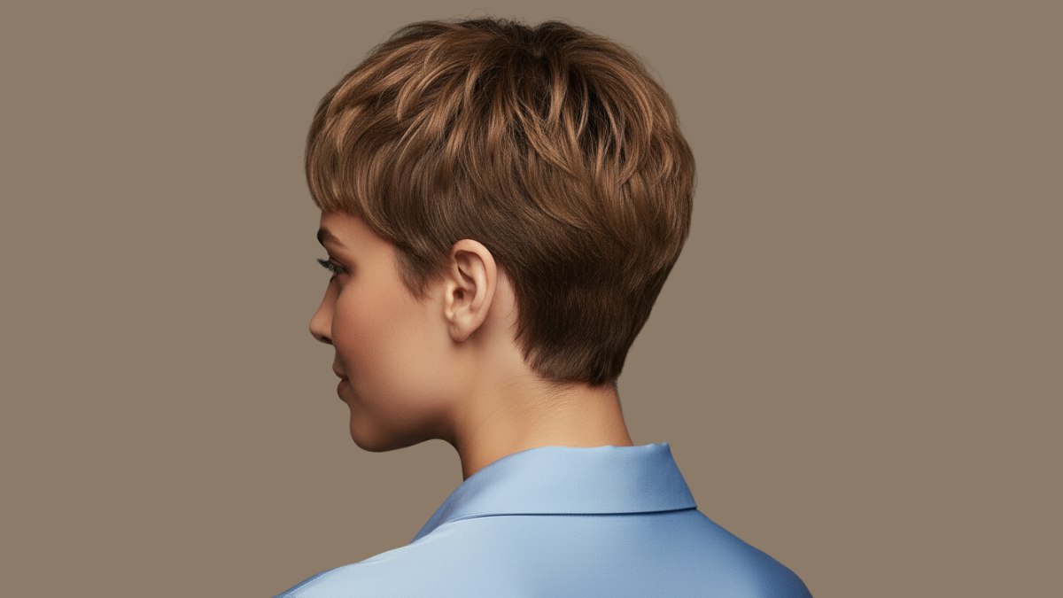 Il s’agit d’une coupe à la garçonne à la fois agréable à porter et très pratique ! La coupe présente des longueurs légèrement plus longues sur le dessus, entre cinq et sept centimètres, ce qui permet du mouvement et une grande polyvalence de coiffage. Les côtés et l’arrière sont beaucoup plus courts, mais sans être tondus à la tondeuse, ce qui crée une silhouette douce et féminine plutôt qu’un contraste trop marqué.