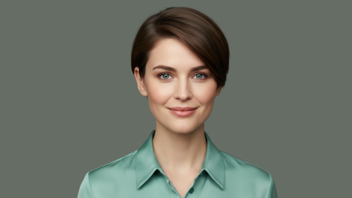 La chemise en soie vert menthe est un véritable coup de maître stylistique. Le tissu lisse et lumineux fait écho à l’aspect brillant des cheveux, créant un ensemble cohérent et éclatant. Le ton frais du vert complète les sous-tons froids du brun, tandis que le col classique apporte une touche qui rehausse l’ensemble du look. Cette association évoque une femme confiante, qui n’a pas peur d’affirmer un style subtil mais distinctif.