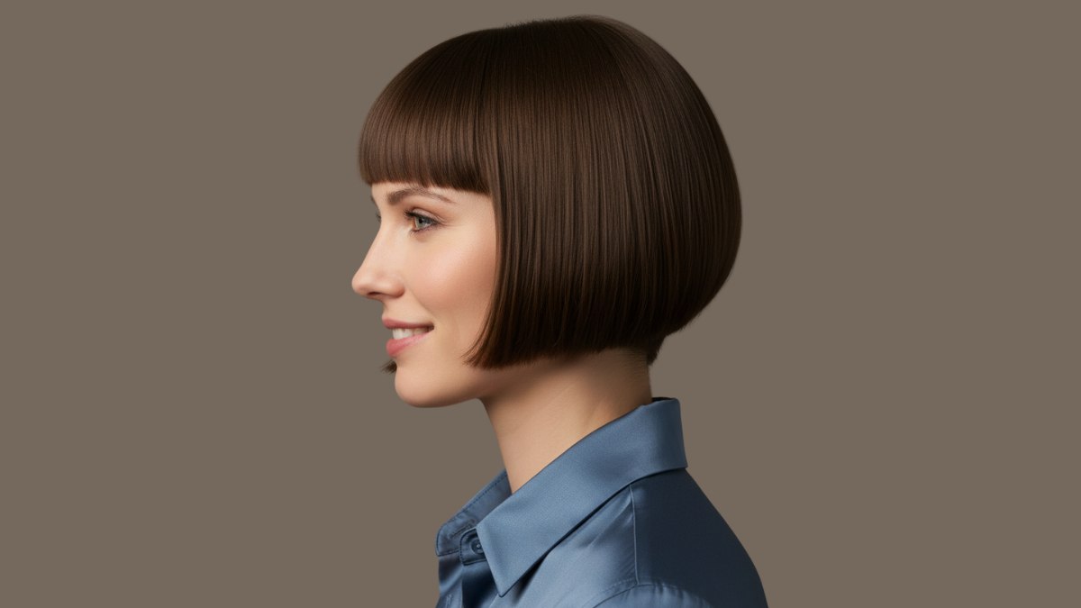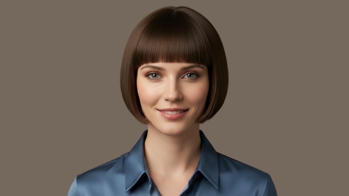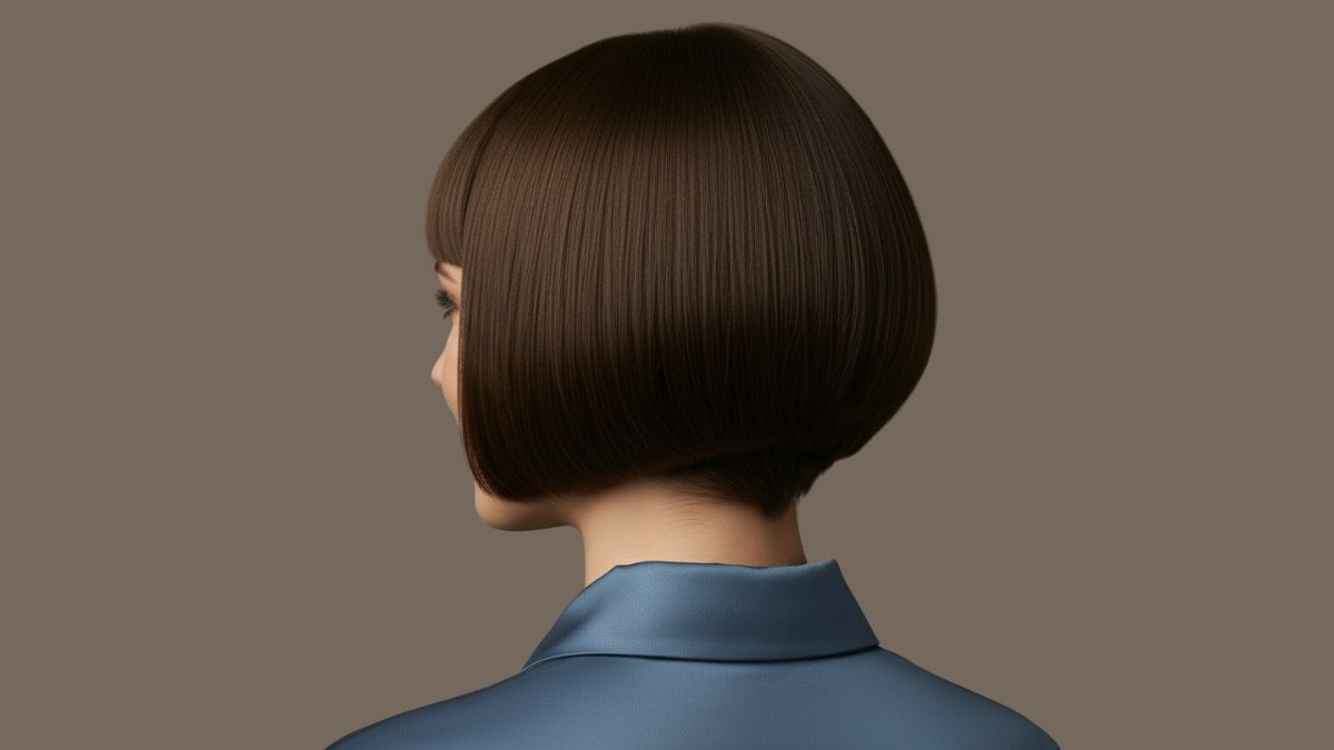 Le coiffage est lisse et arrondi : les cheveux semblent avoir été soigneusement brushés avec une brosse ronde afin de créer une légère courbe vers l’intérieur aux pointes. La surface est impeccable, sans un cheveu déplacé, et la brillance est remarquable. La frange est coiffée bien plate, formant une ligne horizontale marquée qui renforce le caractère architectural de la coupe.
