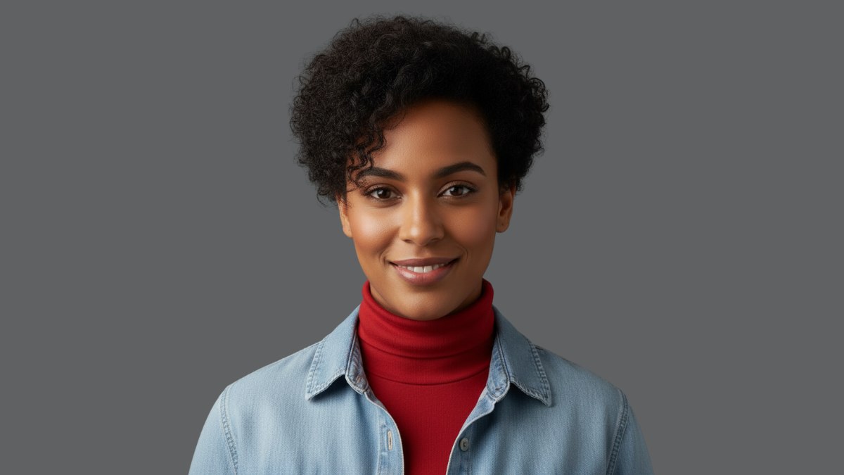 La tenue est choisie avec beaucoup de justesse pour accompagner cette coiffure. La chemise en denim clair offre une base décontractée, tandis que le col roulé rouge porté en dessous apporte chaleur et sophistication. Cette association de couleurs fonctionne à merveille avec les cheveux noirs naturels. Le rouge profond rappelle les sous-tons chauds de la chevelure, et le denim bleu froid apporte du contraste sans entrer en concurrence.