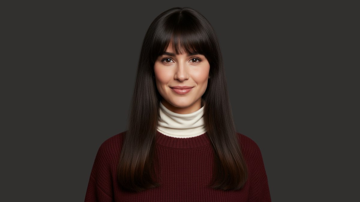L’association avec la tenue est parfaitement harmonieuse. Le col roulé crème offre une base douce et neutre qui ne rivalise pas avec la chevelure, tandis que le pull en maille bordeaux apporte une chaleur qui fait écho aux nuances chocolat de la couleur. Le col montant crée une ligne élégante qui équilibre la ligne horizontale de la frange, et la palette de couleurs chaudes et automnales renforce la cohérence de l’ensemble.