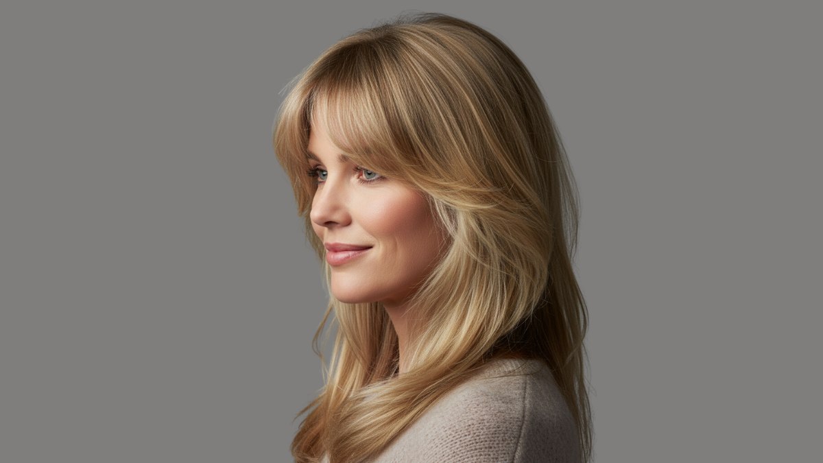 Le coiffage met en valeur des ondulations douces et souples. Il ne s’agit pas de boucles serrées et structurées, mais de légers mouvements qui captent la lumière et accompagnent naturellement chaque mouvement de la tête. La frange est coiffée de chaque côté, avec une texture légère et effilée qui ouvre le visage sans l’alourdir.