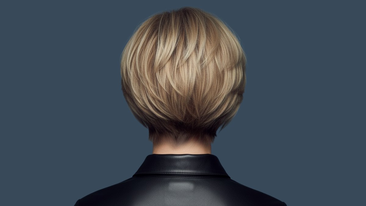 La chemise en cuir noir crée un contraste saisissant avec la couleur blonde des cheveux, faisant ressortir toute leur luminosité. La teinte sombre et sophistiquée du vêtement constitue un arrière-plan idéal pour mettre en valeur les nuances du blond, tandis que la structure du cuir fait écho à la précision de la coupe.