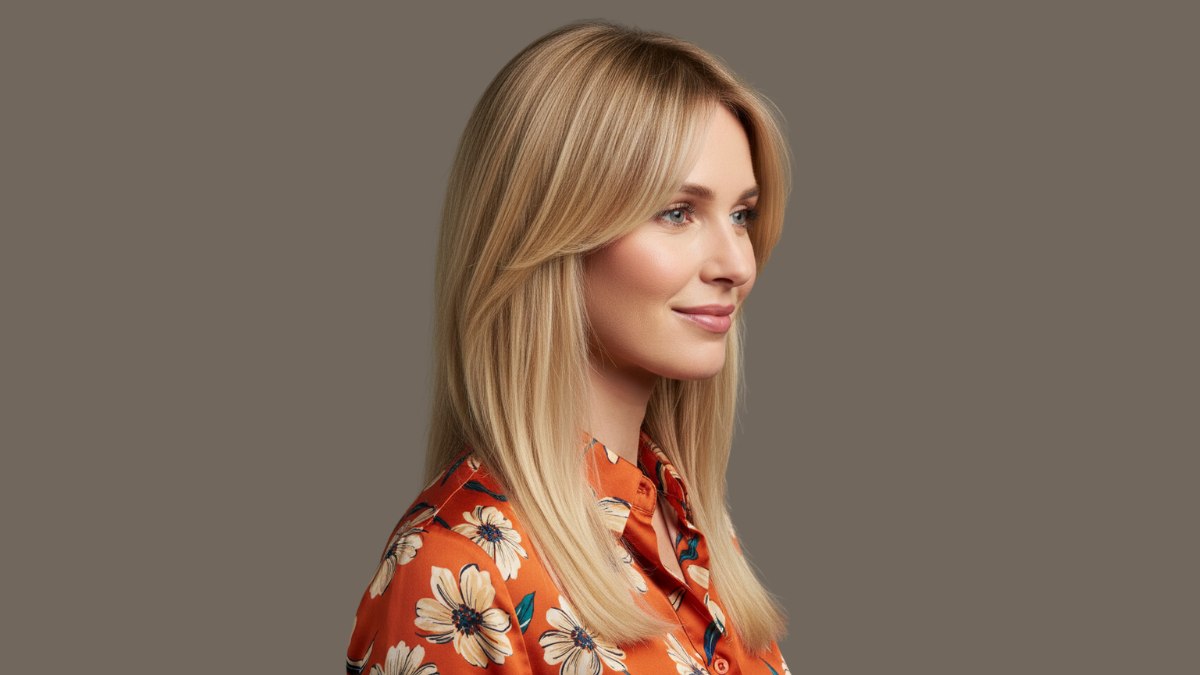 La couleur est un blond miel riche, travaillé en nuances grâce à un jeu de mèches claires et plus foncées. Ce blond paraît naturel, avec des touches lumineuses autour du visage et des tons plus profonds et chaleureux intégrés dans les longueurs et les pointes. La couleur semble rayonner de l’intérieur, signe de cheveux en parfaite santé, soigneusement entretenus avec des produits de qualité.