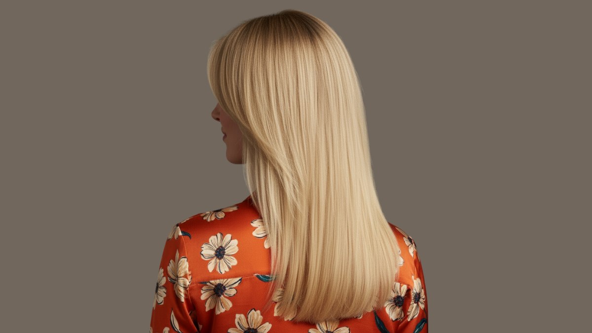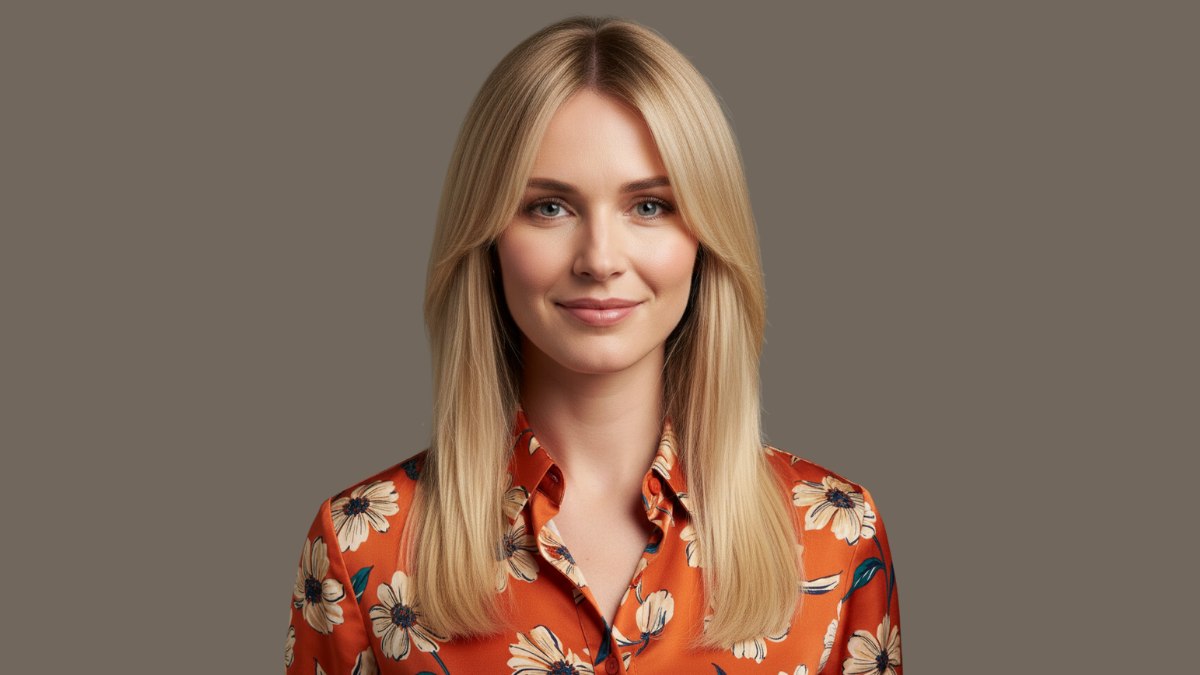 La blouse fleurie orange apporte une touche de couleur idéale face à ce blond chaleureux. Le motif de marguerites évoque une esthétique rétro, inspirée des années soixante-dix, à la fois fraîche et ludique. La palette d’oranges, de crèmes et de bleus diffuse une chaleur qui s’accorde parfaitement aux reflets miel des cheveux. Voilà comment porter des cheveux longs blonds avec assurance et style.