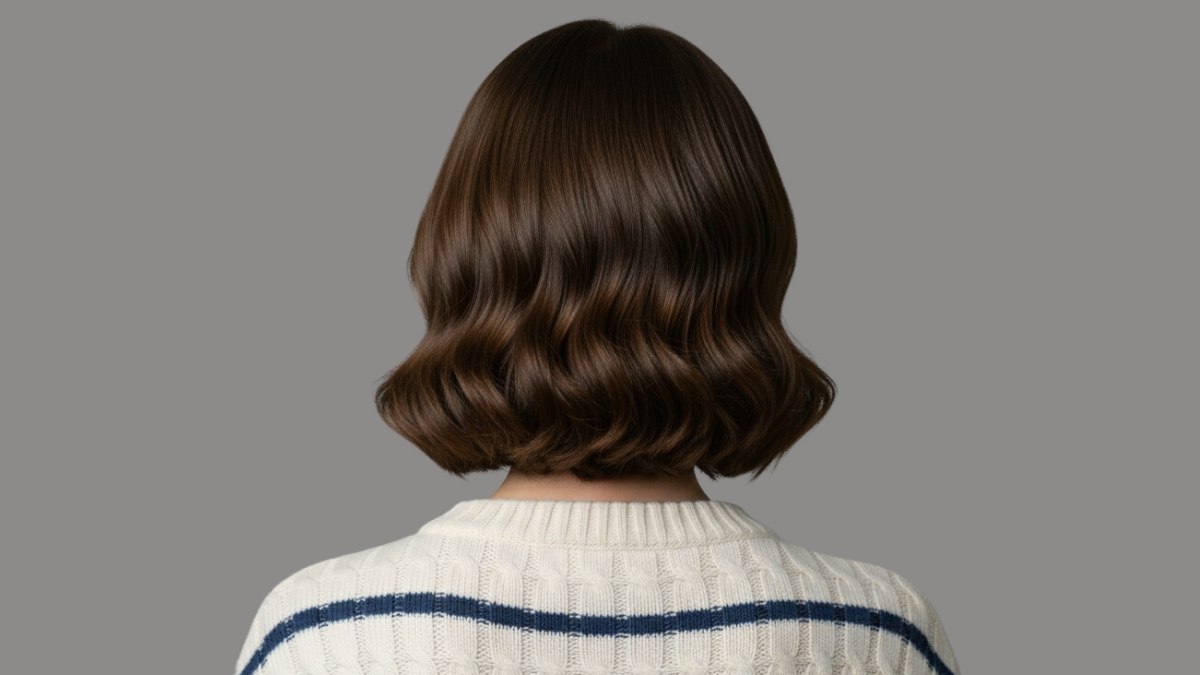 Cette coiffure met en valeur un carré ondulé qui arrive à mi-hauteur de la nuque, créant une silhouette parfaitement équilibrée qui flatte le visage sous tous les angles. La coupe présente des dégradés doux qui apportent du mouvement et permettent aux cheveux de former naturellement des ondulations en forme de S.