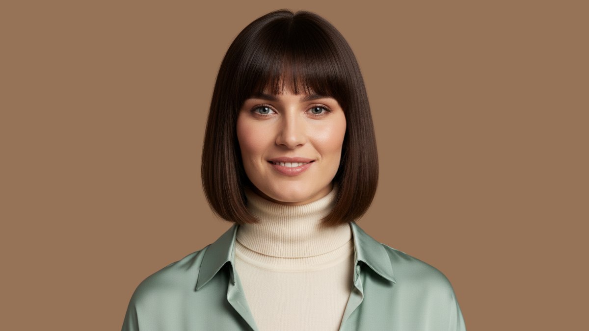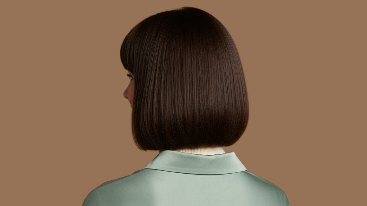 Voici une véritable leçon de coupe de précision : un carré droit parfaitement exécuté, dont la longueur se situe juste en dessous de la mâchoire. La ligne de coupe est impeccablement droite à l’arrière, créant une silhouette géométrique intemporelle. Ce qui distingue ce carré, c’est l’ajout d’une frange coupée nette qui arrive aux sourcils, encadrant le visage avec beaucoup de sophistication.