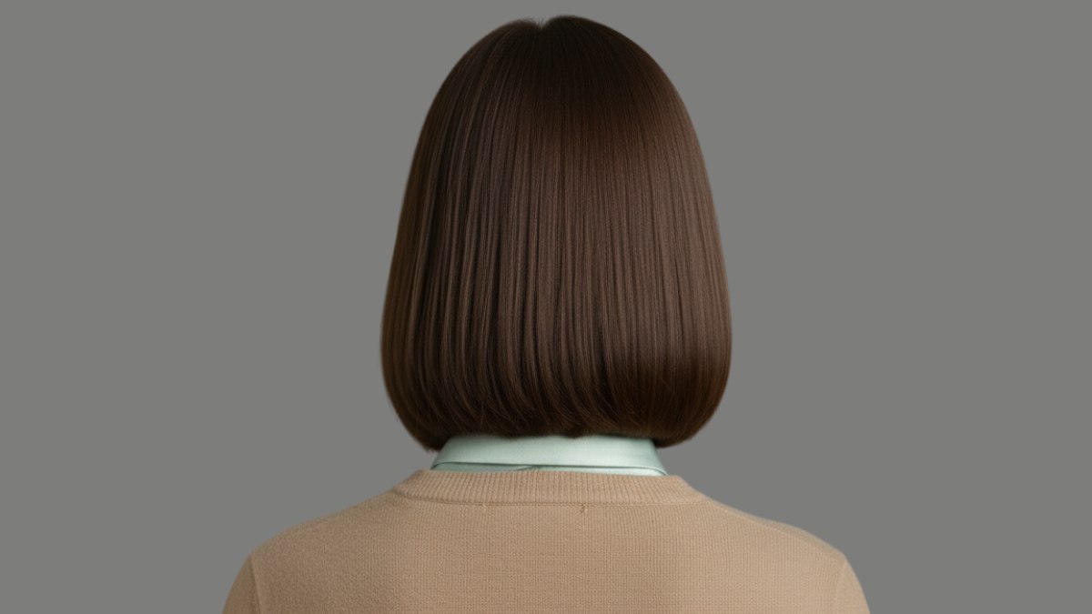 Cette coiffure est un carré intemporel, sublimé par l’ajout d’une frange affirmée qui attire immédiatement l’attention. La longueur arrive précisément au niveau du col, créant une ligne nette et structurée, ni trop courte ni trop longue.