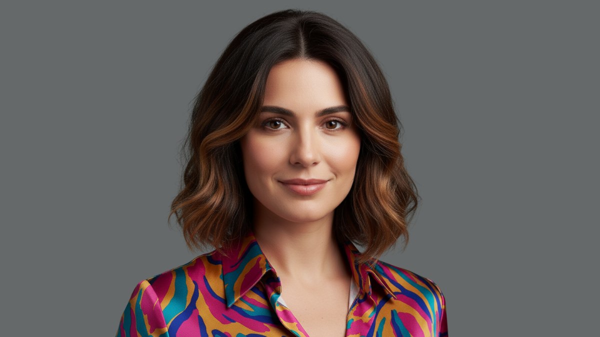 Le chemisier est un complément parfait à cette coiffure mi-longue. L’imprimé multicolore aux nuances de fuchsia, turquoise, or et violet crée une harmonie visuelle dynamique avec les tons chauds des cheveux. Le tissu fluide et soyeux ainsi que le motif audacieux expriment assurance et créativité, en parfaite adéquation avec le caractère avant-gardiste du traitement ombré.