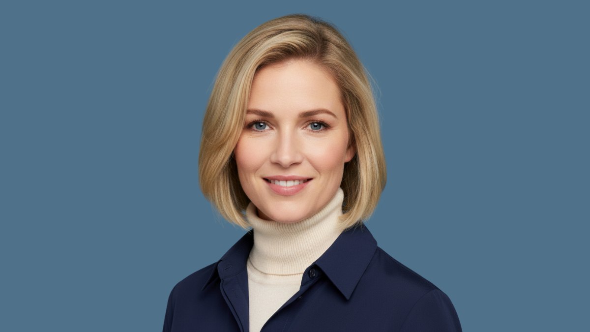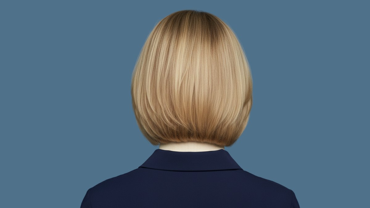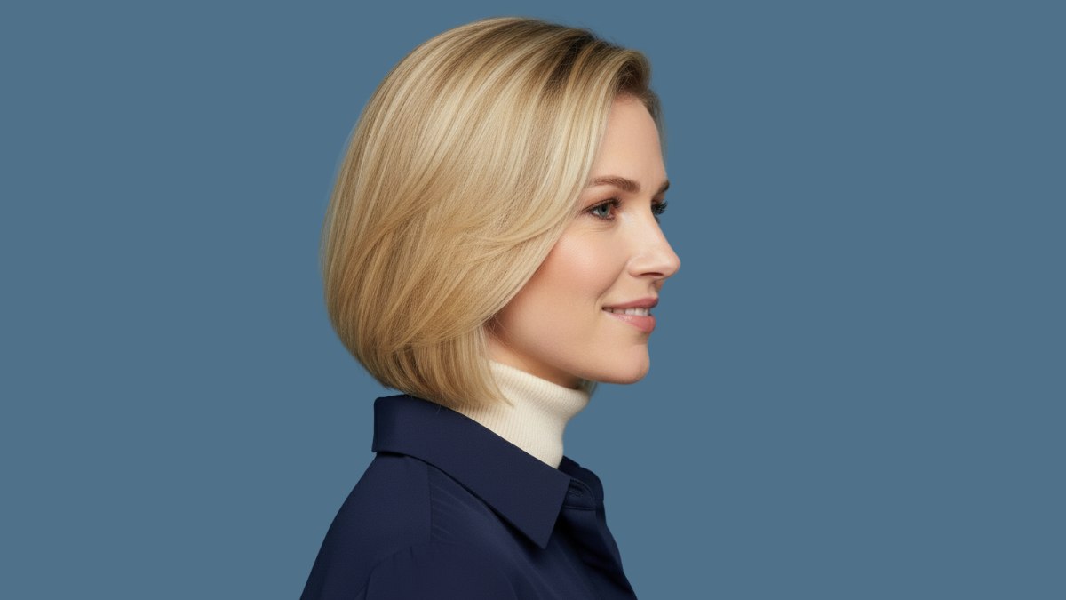 Le bleu est une teinte universellement flatteuse, synonyme de professionnalisme et d’élégance, tandis que le col structuré apporte une touche nette qui dialogue parfaitement avec les lignes épurées du carré. Le col roulé crème porté en dessous ajoute de la profondeur à la tenue et assure une transition douce entre la chemise bleue et le blond lumineux des cheveux.