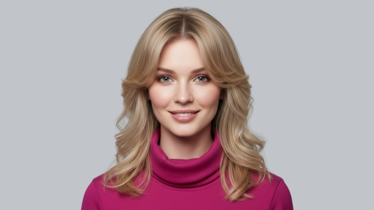 Le col roulé magenta vif constitue un choix audacieux pour accompagner cette coiffure. Sa teinte crée un contraste saisissant avec le blond chaud, faisant ressortir à la fois la couleur et le mouvement des cheveux. L’encolure montante souligne le dégradé autour du visage et attire le regard vers la brillance et la légèreté des ondulations.