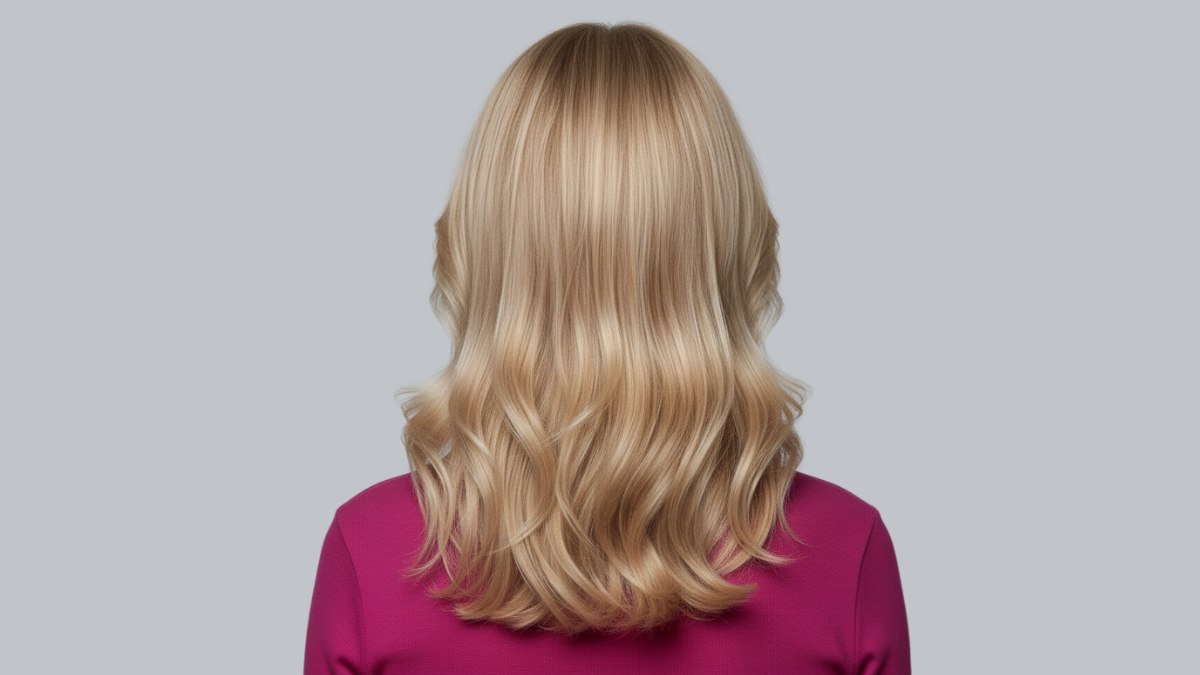 Ce look blond mise tout sur une couleur luxueuse, riche en nuances, et sur des ondulations parfaitement sculptées. Les cheveux ont été coupés en longs dégradés encadrant le visage, avec un effet rideau subtil sur le devant, créant une frange rideau modernisée par des mèches plus douces et plus longues.