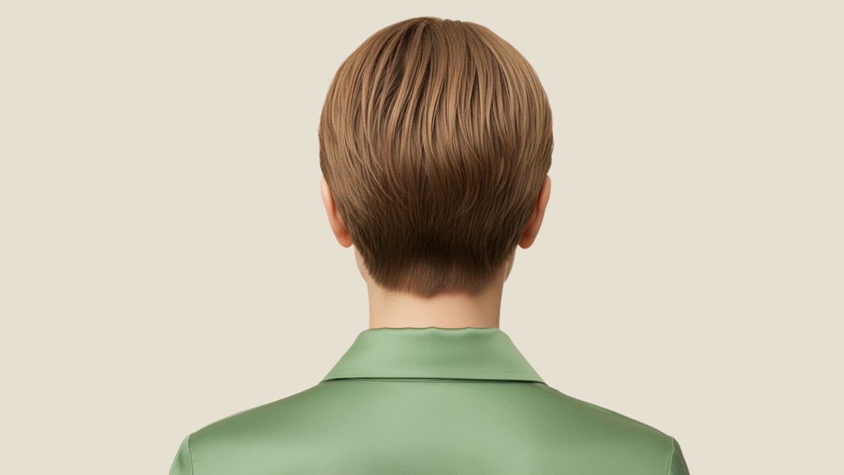La couleur est un châtain clair aux nuances froides, rehaussé de subtils reflets plus clairs qui apportent de la dimension. Ces mèches accrochent la lumière et ajoutent du mouvement, évitant que la coupe courte ne paraisse trop stricte ou monotone. La tonalité légèrement cendrée est très actuelle et s’harmonise parfaitement avec la structure affirmée de la coupe.
