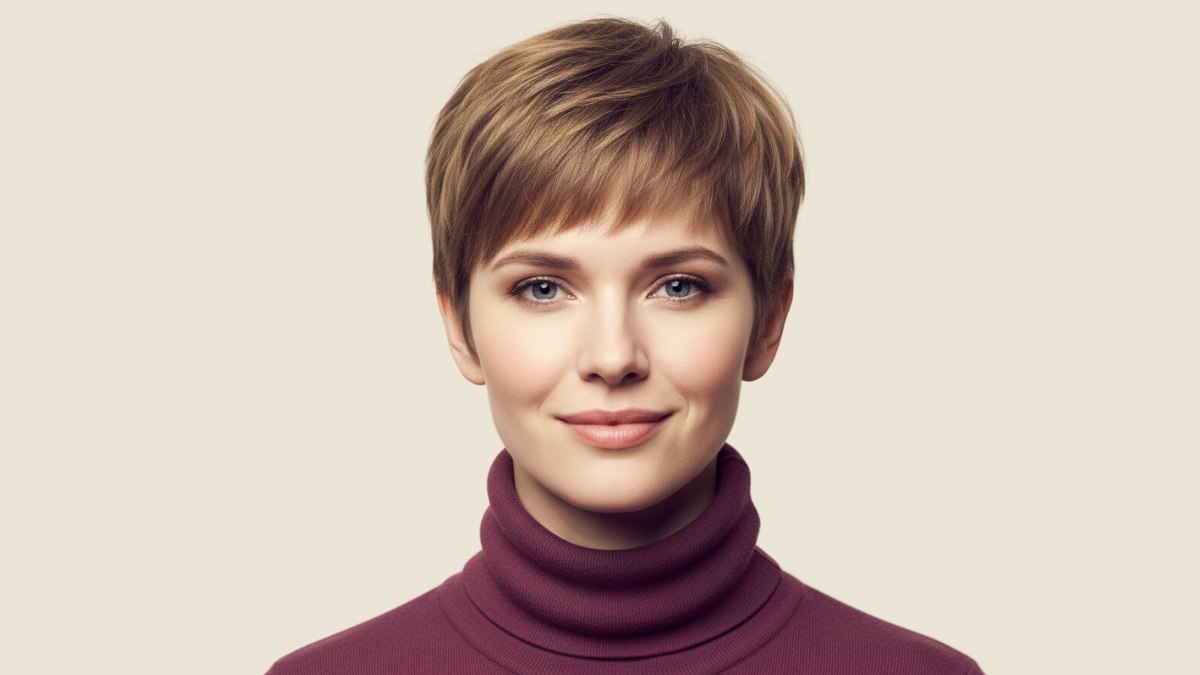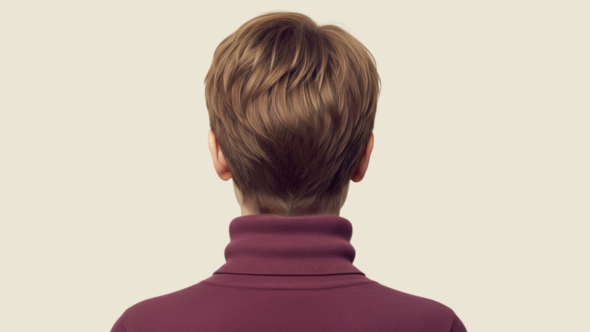 La couleur est un excellent exemple de la manière d’apporter de la dimension aux cheveux courts. La base est un brun moyen chaud, rehaussé de mèches caramel et miel, principalement concentrées sur le dessus et la frange, là où elles captent le mieux la lumière. Cette répartition des tons plus clairs accentue l’impression de texture et de mouvement, tandis que les sous-tons plus foncés sur les côtés et l’arrière apportent de la profondeur et évitent un effet plat.