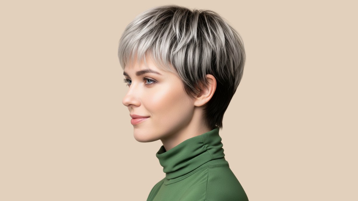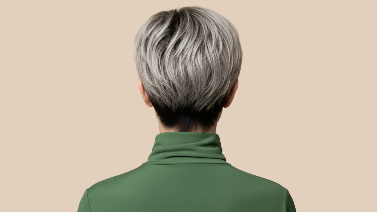 Ce qui distingue véritablement ce look, c’est la magnifique couleur gris argenté. Ce n’est pas un gris classique, mais une teinte résolument moderne et audacieuse. La coloration semble être appliquée sur l’ensemble de la chevelure dans un argent froid, avec de subtiles variations de profondeur créant un effet sel et poivre qui apporte de la dimension. Des tons charbon plus foncés apparaissent aux racines et dans les sections plus courtes de la nuque, offrant du contraste et empêchant l’argenté de paraître plat ou uniforme.