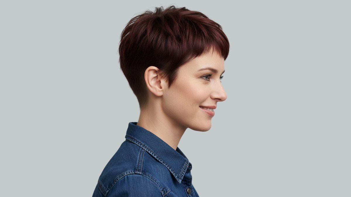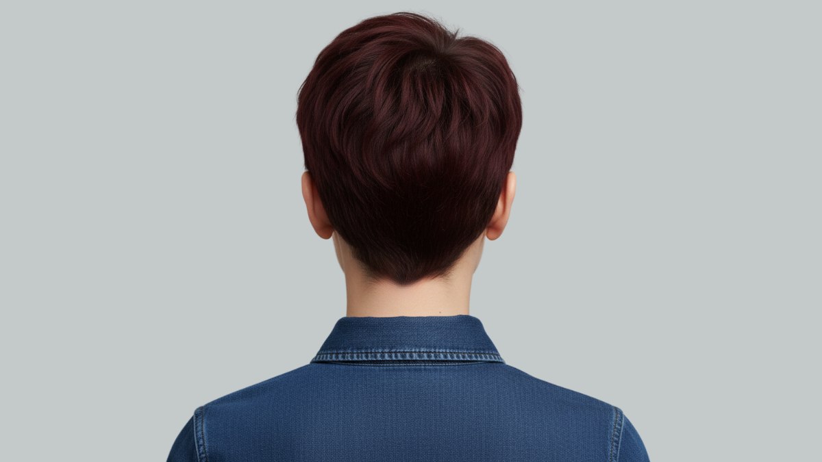La couleur des cheveux est un brun chocolat foncé aux nuances bordeaux qui captent la lumière, ajoutant profondeur et dimension à la coupe. Cette teinte plus profonde crée un contraste saisissant avec une peau claire et fait ressortir le regard.