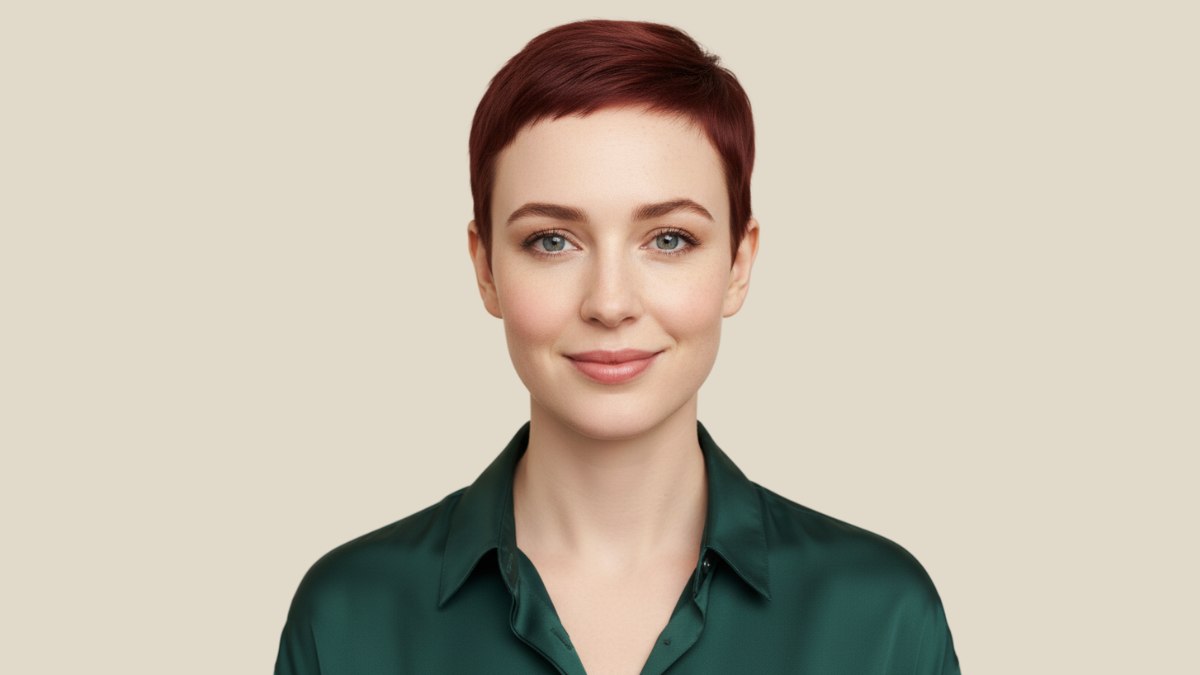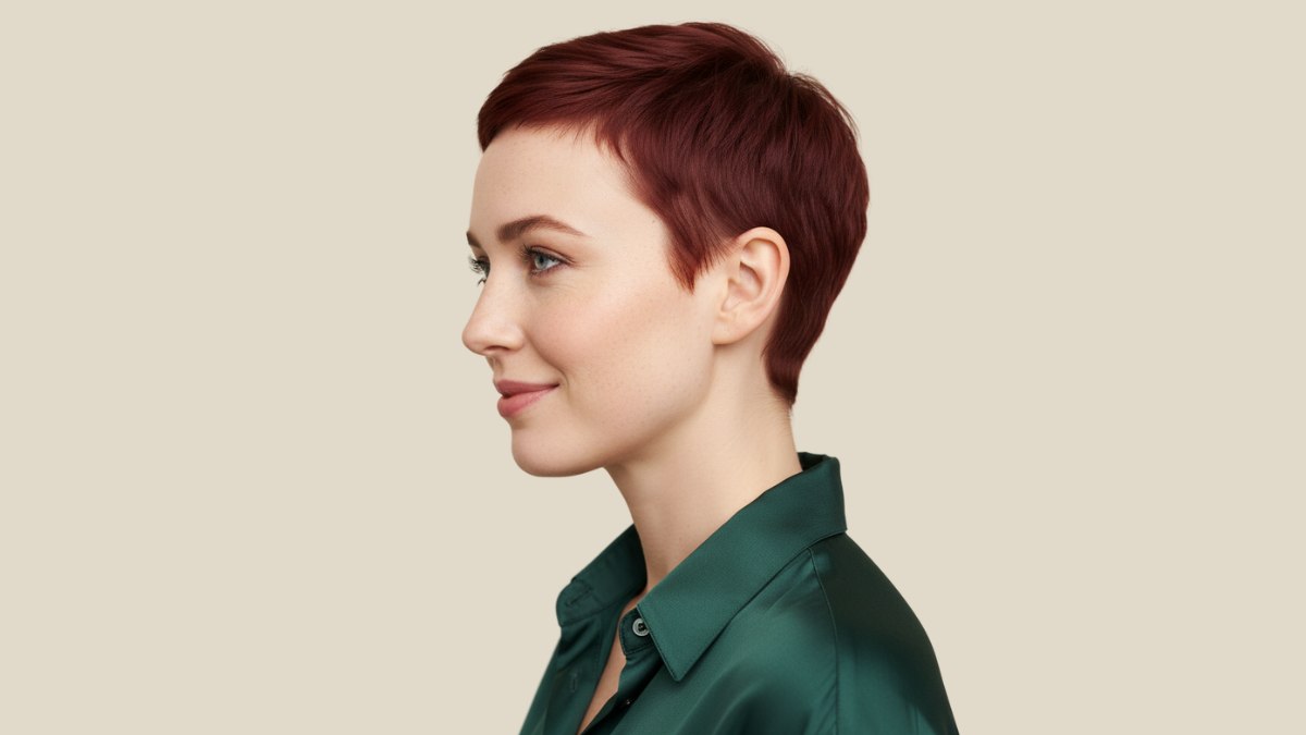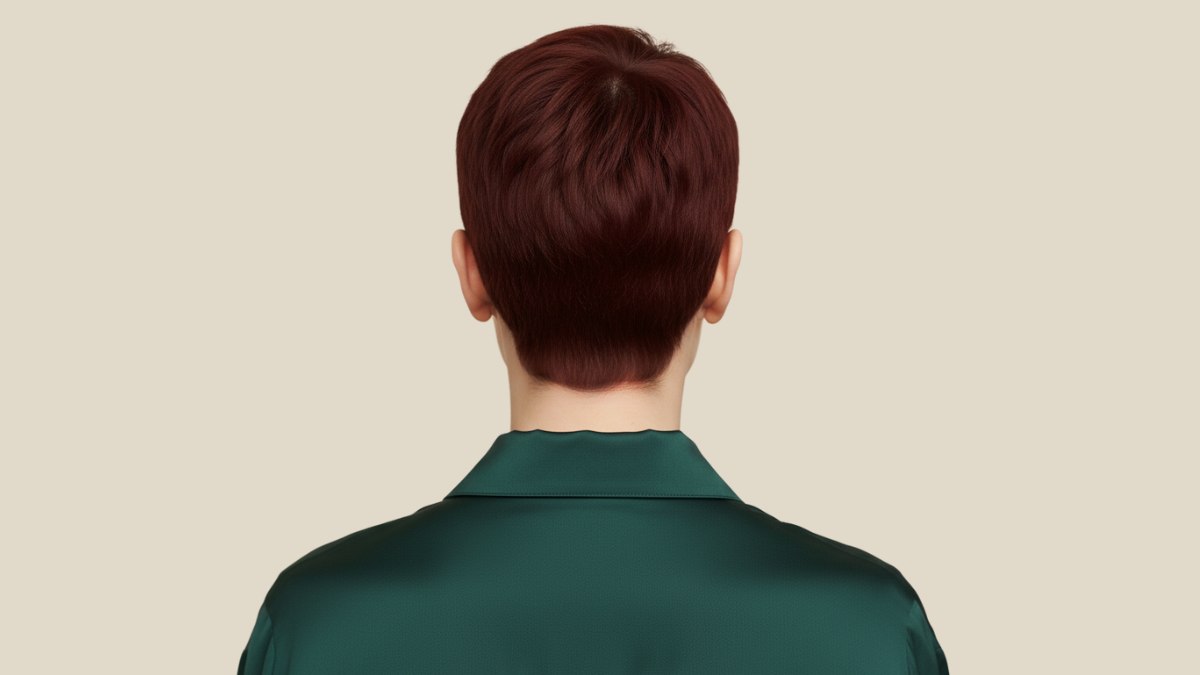 Ce qui distingue cette coiffure courte, c’est l’attention portée aux détails dans la technique de coupe. Le dégradé de la nuque vers le sommet est réalisé avec précision, créant une forme douce et arrondie qui met en valeur la tête. Les pattes sont très courtes et nettes, soulignant la mâchoire et attirant l’attention sur les traits du visage.
