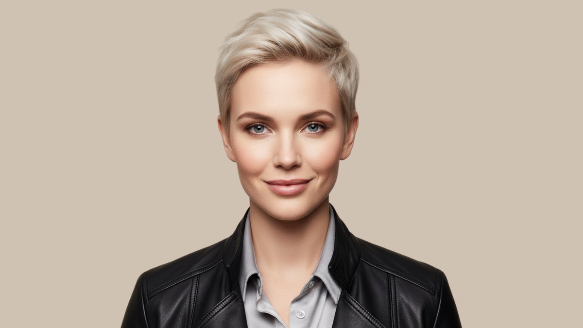 La veste en cuir noir associée à une chemise gris soyeux en dessous forme un excellent duo avec cette coiffure. L’esprit rock et audacieux du cuir s’accorde parfaitement avec la nature affirmée et non conventionnelle de la coupe, tandis que la chemise fluide qui apparaît ajoute une touche de féminité, évitant que l’ensemble ne paraisse trop dur.